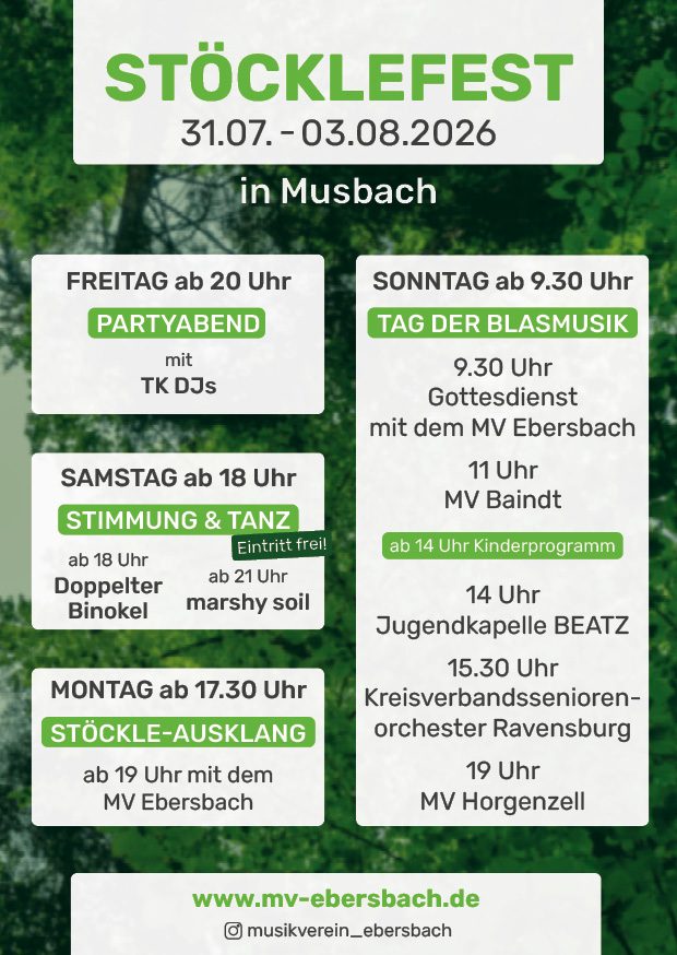 Das Stöcklefest 2026 findet vom 31.07. bis zum 03.08.2026 in Musbach statt. Auf dem Programm stehen am Freitag der Partyabend, am Samstag Stimmung & Tanz, während am Sonntag der Tag im Zeichen der Blasmusik steht. Der Festausklang am Montag bildet den Abschluss.