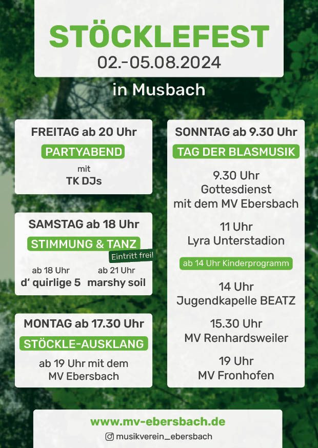 Das Stöcklefest 2024 findet vom 02. bis zum 05. August 2025 in Musbach statt. Auf dem Programm stehen am Freitag der Partyabend, am Samstag Stimmung & Tanz, während am Sonntag der Tag im Zeichen der Blasmusik steht. Der Festausklang am Montag bildet den Abschluss.